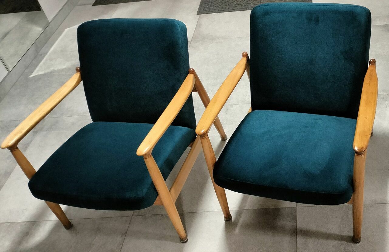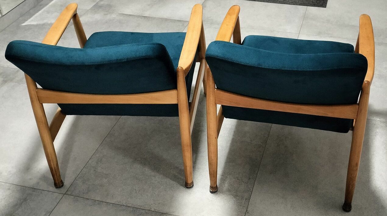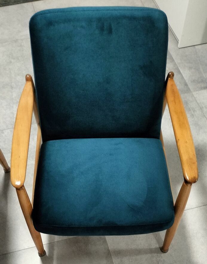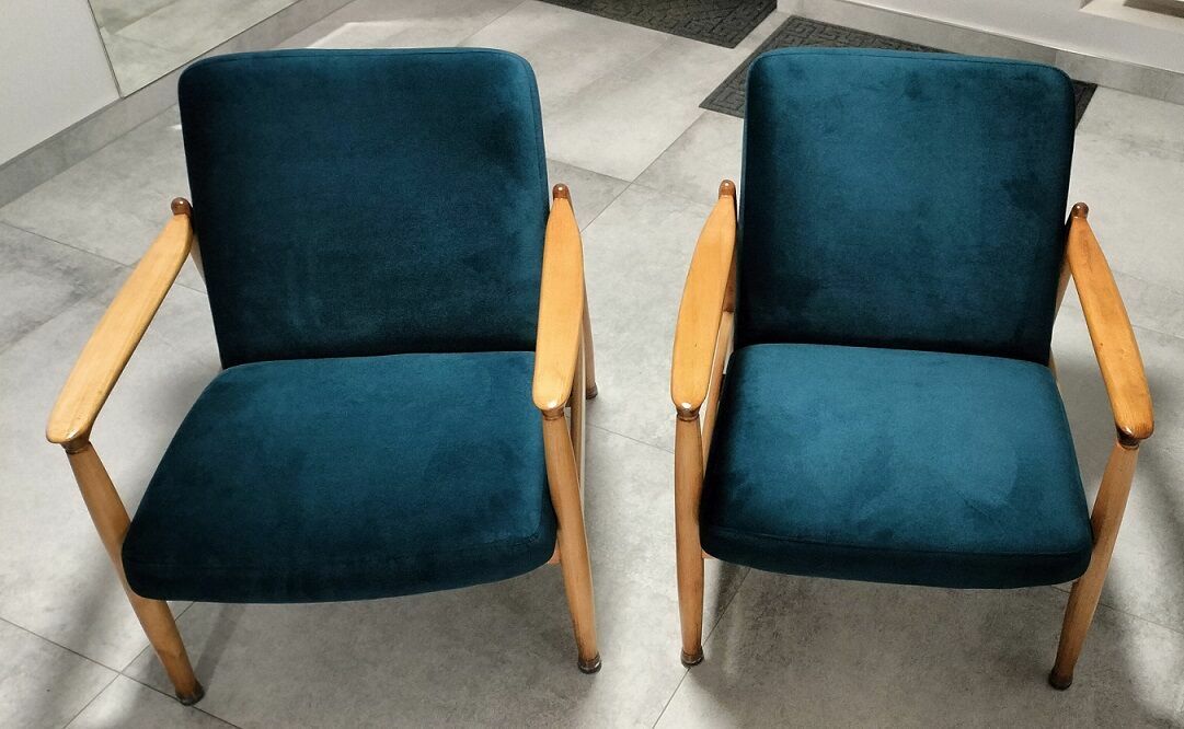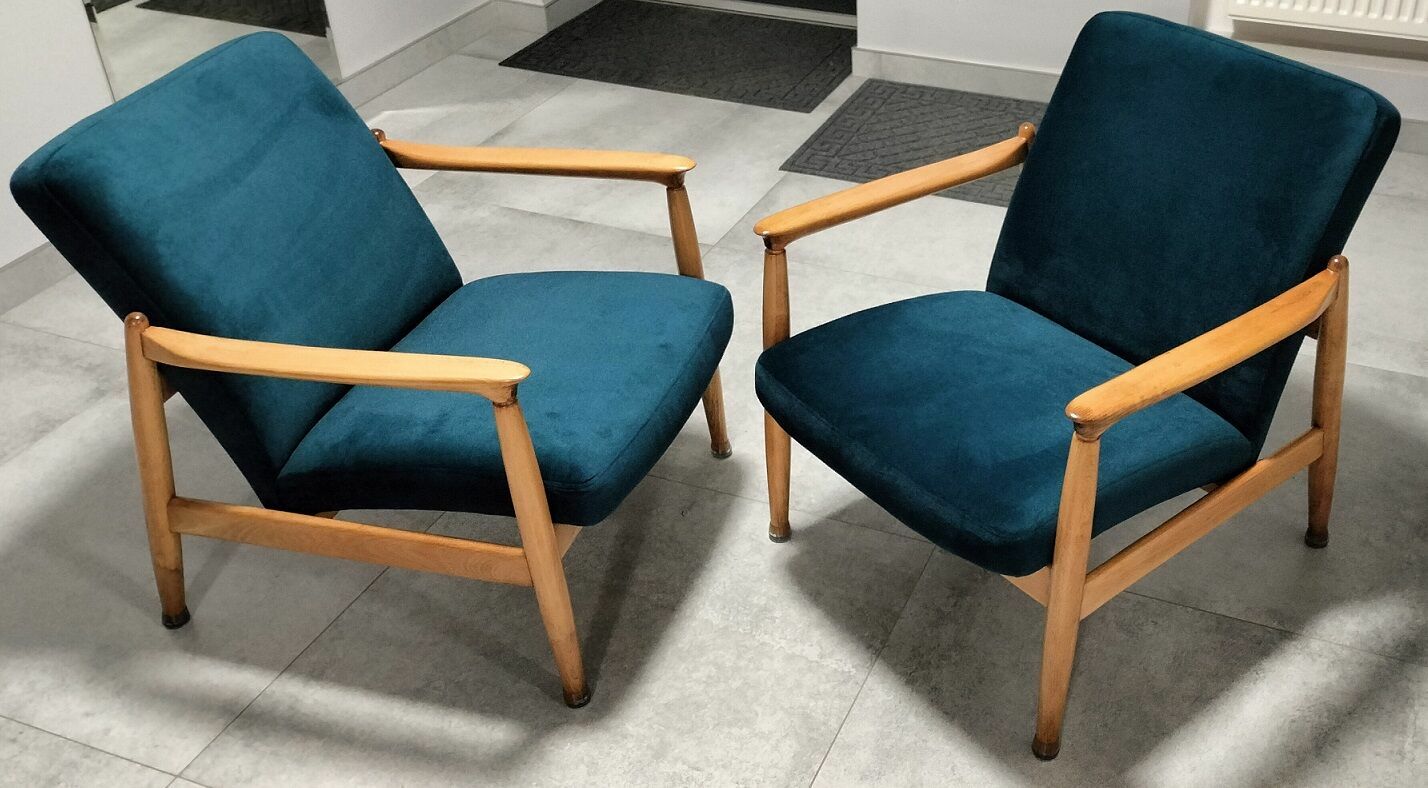 Sprzedam 2 fotele GFM-64 z 1965 r. (typ pm-0/300-188) z Gościcińskiej Fabryki Mebli.Fotele zostały odrestaurowane. Drewniane elementy zostały polakierowane półmatowym bezbarwnym lakierem. Zostały wymienione pasy, wypełnienia i materiał. Zastosowany został materiał KRONOS 04.
